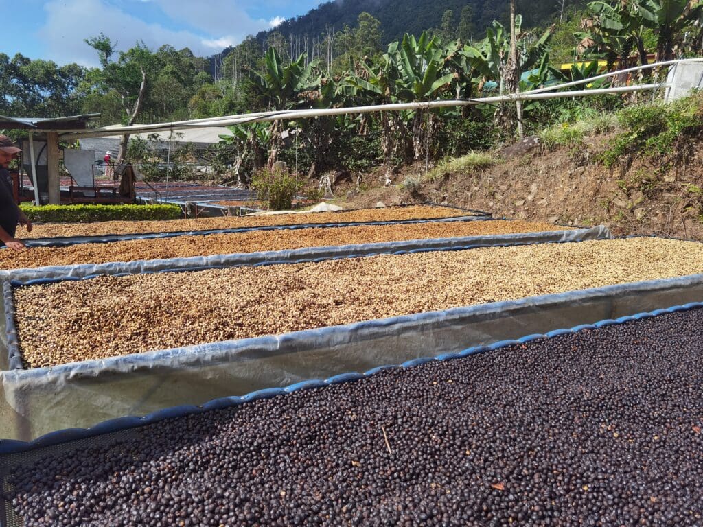 Bu parti, yüksek rakımda yetişen Obata çekirdekli kahvenin özenle işlendiği bir macerado (fermente kurutma) lotudur. Seçilen kirazlar ilk olarak yükseltilmiş yataklarda birkaç gün çevrilerek nemi dengeler. Ardından kapalı tanklarda karbonik macerasyona alınır; burada doğal olarak oluşan karbondioksit sayesinde mikroorganizmalar şekerleri parçalamaya başlar ve 4–6 gün süren kontrollü bir fermantasyon gerçekleşir. Bunun ardından kirazlar uzun ve yavaş bir kurutma sürecine girer; 25–28 °C kontrol altında yaklaşık 22–30 gün boyunca kurutulur. Nihai nem %10’a ulaştıktan sonra çekirdekler 18 °C’de yaklaşık 2 ay dinlendirilir, böylece aroma ve yapısı stabilize olur.